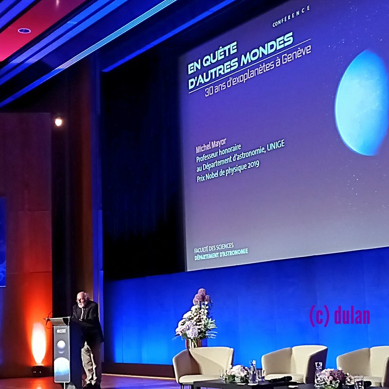 Huynh Ngọc Hân ơi, tuần trước sóc chị dự cuộc họp Tìm kiếm thế giới khác: 30 năm ngoại hành tinh ở Genève (trong hình là thầy Michel Mayor, người đoạt giải Nobel Vật Lý 2019):