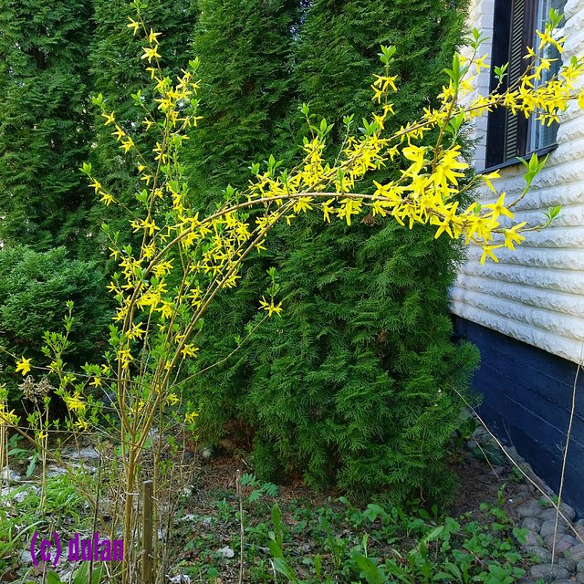 Nhà dulan có trồng hoa Forsythia, hình mùa hè năm ngoái, cây còn nhỏ mà hoa nhiều nè huynh: