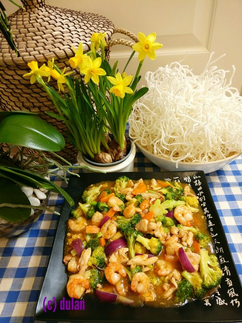 Bún xào giòn với tôm, gà, bông cải xanh: