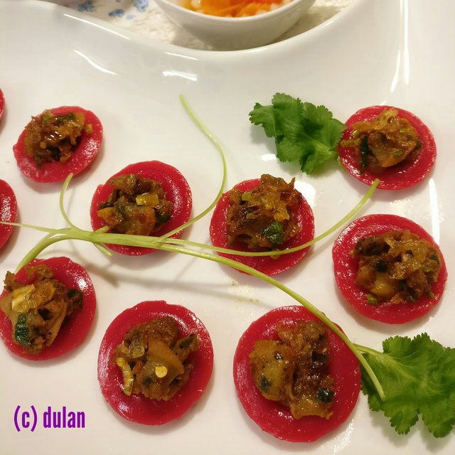 Món bánh bèo Huế màu củ dền nhân hến: