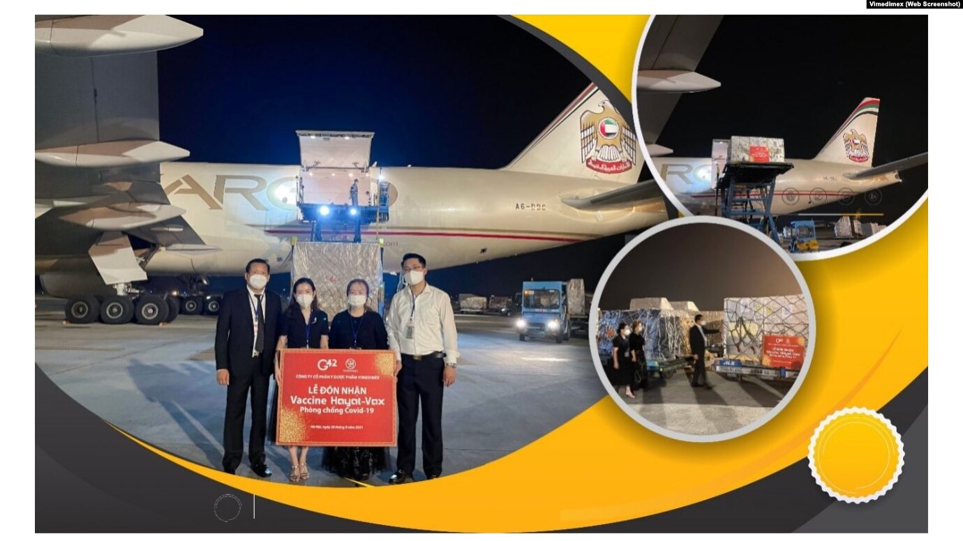 Việt Nam vừa nhận lô hàng một triệu liều vaccine COVID-19 Hayat-Vax từ Các Tiểu vương Quốc Ả Rập Thống nhất (UAE), nhưng thực chất là vaccine của Công ty dược phẩm Sinopharm của Trung Quốc và được gia công tại UAE, để bổ sung vào nguồn vaccine COVID-19 dùng trong chiến lược tiêm chủng quốc gia.