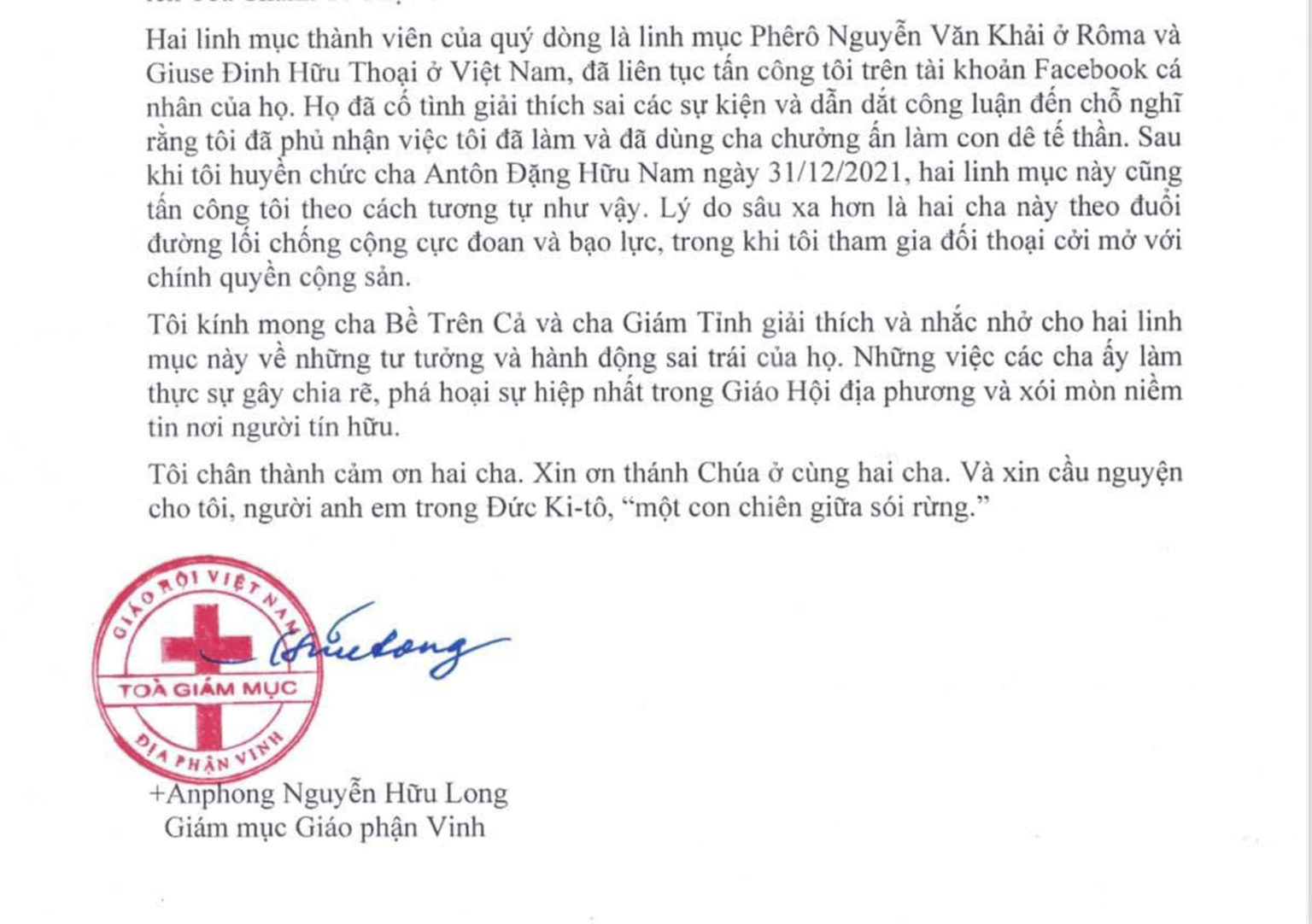 Theo hình chụp văn bản đăng trên Facebook Lộc AnHà hôm 9 Tháng Sáu, bức thư đề ngày 9 Tháng Ba của Giám Mục Long đề gửi Linh Mục Rogerio Gomes (bề trên Dòng Chúa Cứu Thế) và Linh Mục Nguyễn Đức Thông (giám tỉnh Dòng Chúa Cứu Thế Việt Nam).