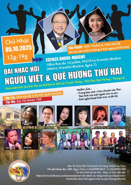 18bis Rue du 14 Juillet, 94270 Le Kremlin-Bicêtre (cùng địa điểm tổ chức chương trình “Đại Nhạc Hội Người Việt và Quê Hương Thứ Hai” ngày 5/10).