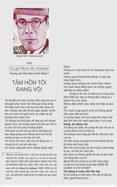 Marco, một người bạn Ý, gửi cho tôi đường link của một bài thơ và dặn : "Đọc ngay đi, nó sẽ làm ta thay đổi". Bài thơ kỳ diệu này xin dành tặng cho tất cả những bạn 50 tuổi trở lên. Bài thơ này đươc viết bởi Mario de Andrade (1893-1945) là một nhà thơ, tiểu thuyết gia, nhà âm nhạc học, nhà sử học, nhà phê bình nghệ thuật và nhiếp ảnh gia người Brazil.