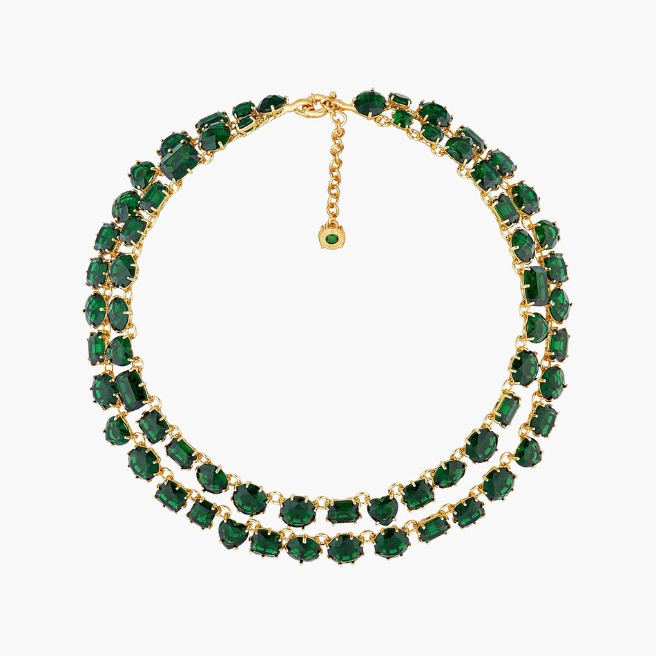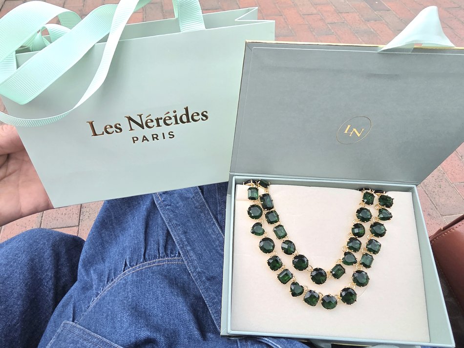 Rồi dạo loanh quanh, đưa chân vào tiệm trang sức nổi tiếng Les Néréides (Paris). Nghĩ rằng đang dư thời gian, cưỡi ngựa xem hoa chơi. Thế mà dừng lại ở chỗ vòng đeo cổ với những hạt pha lê (crystal) màu xanh lục bảo đậm trong bộ sưu tập Diamantine của họ. Đá là là hạt Crystal, còn dây thì bằng đồng thau được mạ vàng 18 tinh xảo. Tôi nghĩ rằng khi nào ngày vui trọng đại của các con tôi, tôi đeo vào với áo dài kiểu truyền thống cổ cao sẽ trông trang trọng và ra dáng dấp Bà Sui. Sớm muộn chi cũng cần, tôi quyết định mua sau khi gọi anh Nheo vào thẩm định thêm giá trị thẩm mỹ. Ban đầu anh ừ à nếu thấy thích thì cứ mua chứ không quan tâm lắm. Một lúc anh mới bắt đầu chú ý và dần dần thấy món này cũng hay hay, đẹp, tôi biết chọn.