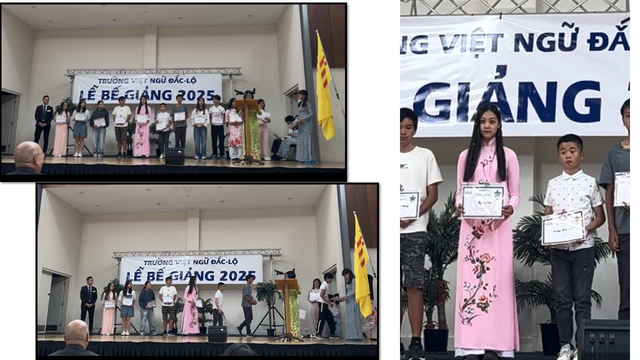 Bé Xuân Nghi đi lãnh bằng khen tiếng Việt trong trường Việt ngữ Đắc Lộ có 3 chi nhánh ở Adelaide được thành lập với ba mục đích.