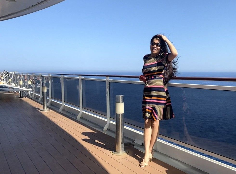 Tóc dài, "Tóc Mây, Vùng Tóc Rối" có nhiều cái vui nè. Lúc này em đang nhìn Biển Đỏ trên boong du thuyền Ý, trong hành trình từ Jordan đến Saudi Arabia .